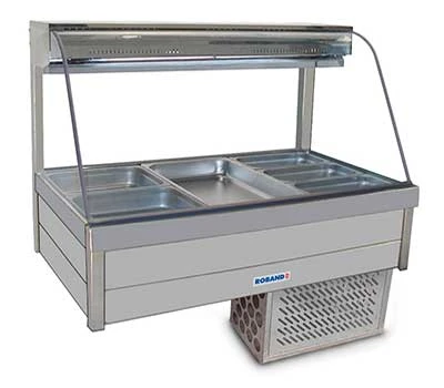 SPECIFICATION: Double row with rear roller doors and pans – Curved glass cold plate with cross fin coil food bar
