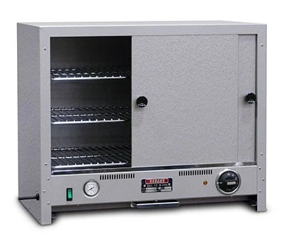 FEATURES: Precise thermostat control, Has sliding steel doors, Three removable wire shelves, and is designed for pies and food containers. Double skin cavity for even temperature and low running costs, Thermometer. Suits building sites.