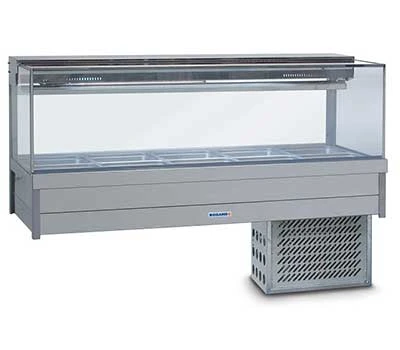 SPECIFICATION: Double row with rear roller doors and pans – Square glass refrigerated cold plate & cross fin coil food bar