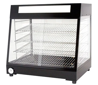 FEATURES: Steel construction with black powder coated finish, Toughened glass sliding doors to front & back, Removable angled chrome wire racks (4 of), Top lightbox for branding (branding not included), Full internal lighting for improved display, Separate illuminated power & light switches, Mechanical thermostat control with temperature gauge, Removable stainless steel crumb tray & element guard, Designed to hold product between 70 – 80°C. Product must be heated above 65°C prior to display.